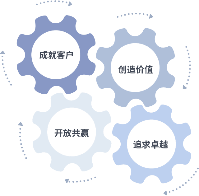 成就客户是一切决策的出发点,,创造价值是衡量所有工作的标准,,,追求卓越是我们做事做人的态度,,,,开放共赢是我们的格局也是最终的结果。。。价值观的齿轮环环相扣,,推动着组织里的每个人不断向前。。。
