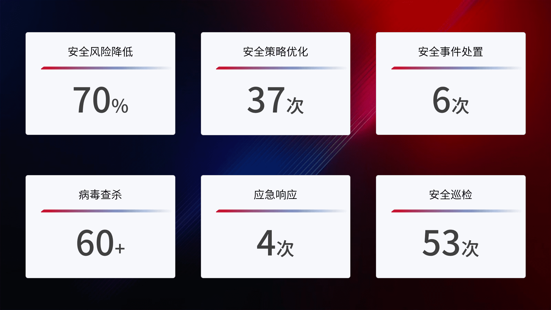 提供全面的安全事件报告体系,,,包括处置报告、、周报、、、、季度和年度总结,,,,结合持续监控,,,帮助客户深入了解网络安全状况。。