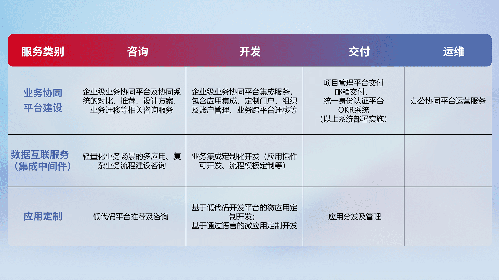 针对钉钉、、企微、、IDaas等平台级产品提供产品的规划、、方案、、、、交付、、、、定制化开发等服务,,实现如统一协同办公、、、智能客户服务、、、混合会议管理、、、智能数据查询、、等业务场景,,,实现数字化转型。。。。